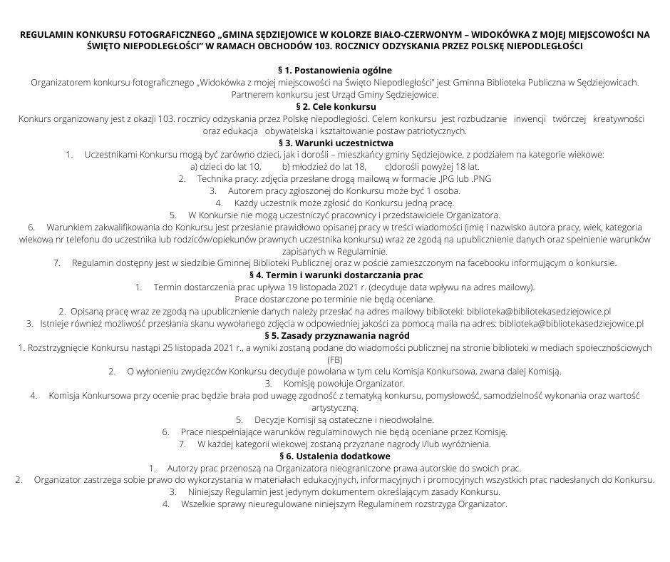 Gminna Biblioteka Publiczna w Sędziejowicach zaprasza do udziału w konkursie fotograficznym z okazji 103. rocznicy odzyskania Niepodległości przez Polskę.