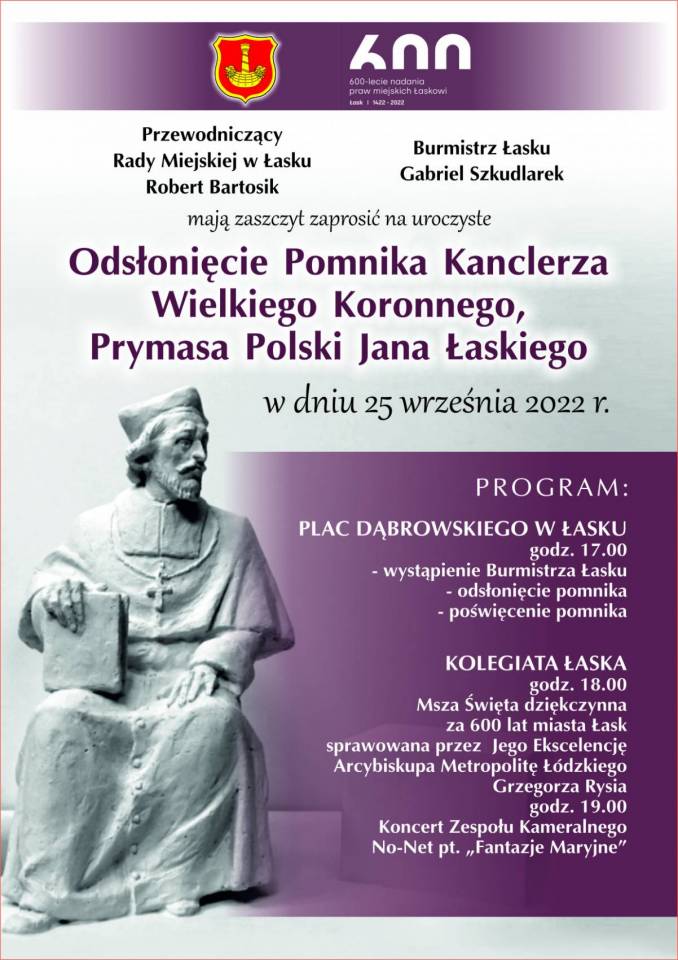 Wykonany z brązu pomnik Jana Łaskiego przyjechał dziś do Łasku. Został przetransportowany pod czujnym okiem swego twórcy, dr. hab. Karola Badyna – polskiego rzeźbiarza, profesora Akademii Sztuk Pięknych w Krakowie. Pomnik już został zamontowany na pl. Dąbrowskiego w Łasku. Jego uroczyste odsłonięcie zaplanowano na 25 września, na godz. 17.00.