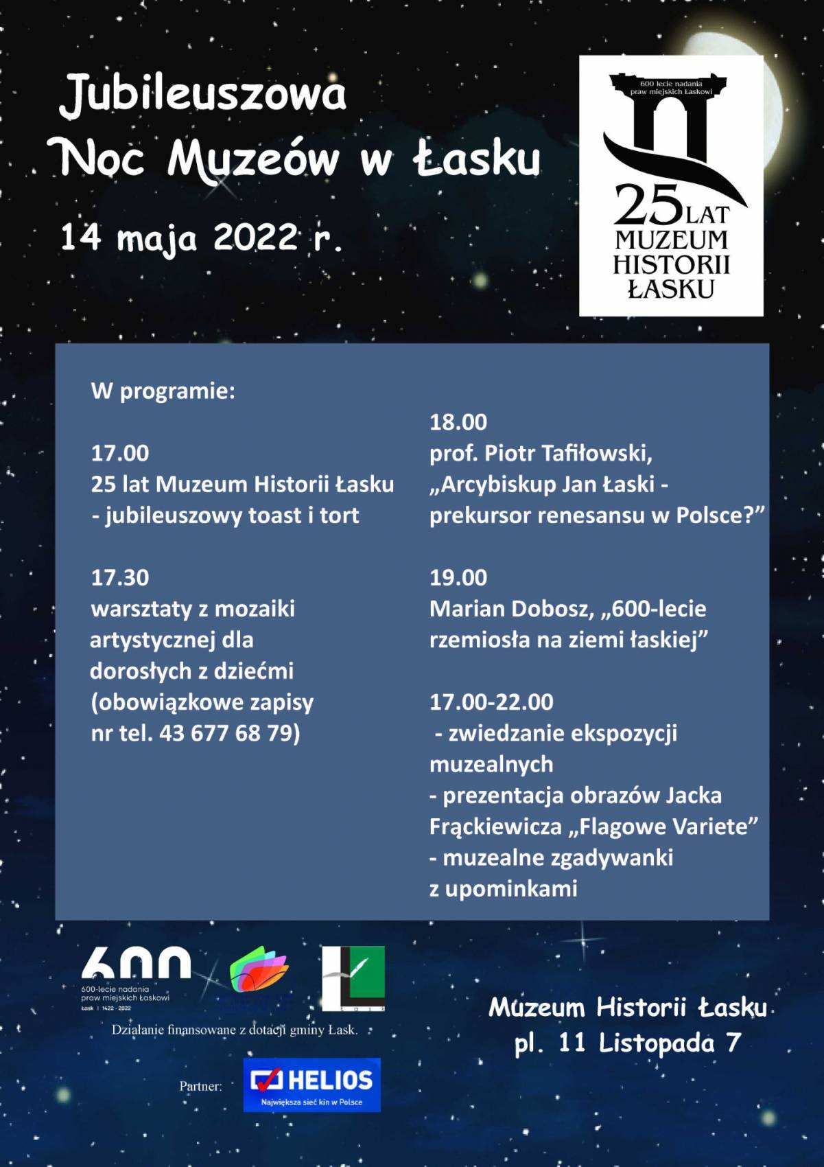 Urodzinową imprezę wraz z nocnym zwiedzaniem zaplanowano na najbliższą sobotę 14 maja. Wszystko o godzinie 17.00 zainauguruje jubileuszowy tost i tort. Pół godziny później ruszą warsztaty mozaiki artystycznej dla dorosłych z dziećmi. Na 18.00 zaplanowano wykład prof. Piotra Trafiłowskiego "Arcybiskup Jan Łaski - prekursor renesansu w Polsce?", a godzinę późnej Marian Dobosz zaprezentuje temat "600-lecie rzemiosła na ziemi łaskiej".