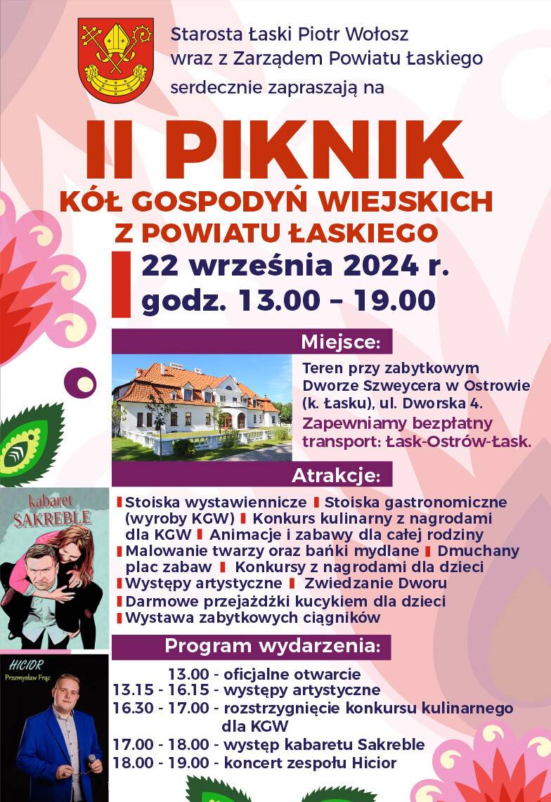 Z wielką przyjemnością w imieniu organizatorów zapraszamy Państwa na II Piknik Kół Gospodyń Wiejskich z Powiatu Łaskiego, który odbędzie się w najbliższą niedzielę, 22 września. Impreza odbędzie się na terenie przy Zabytkowym Dworze Szweycera w Ostrowie, ul. Dworska 4.