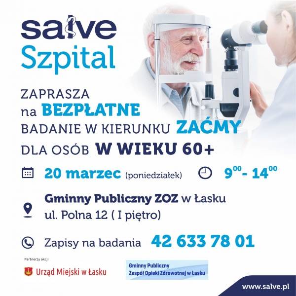 Bezpłatne badania w Łasku zostanie przeprowadzone w poniedziałek 20 marca. Akcja profilaktyczna skierowana do łaskich seniorów będzie prowadzona w kierunku diagnozowania zaćmy. Badanie przeprowadzi specjalista szpitala SALVE w Łodzi. Kto może się zgłosić? Osoby w wieku 60+, każdy chętny może się zarejestrować pod nr telefonu 42 633 78 01.