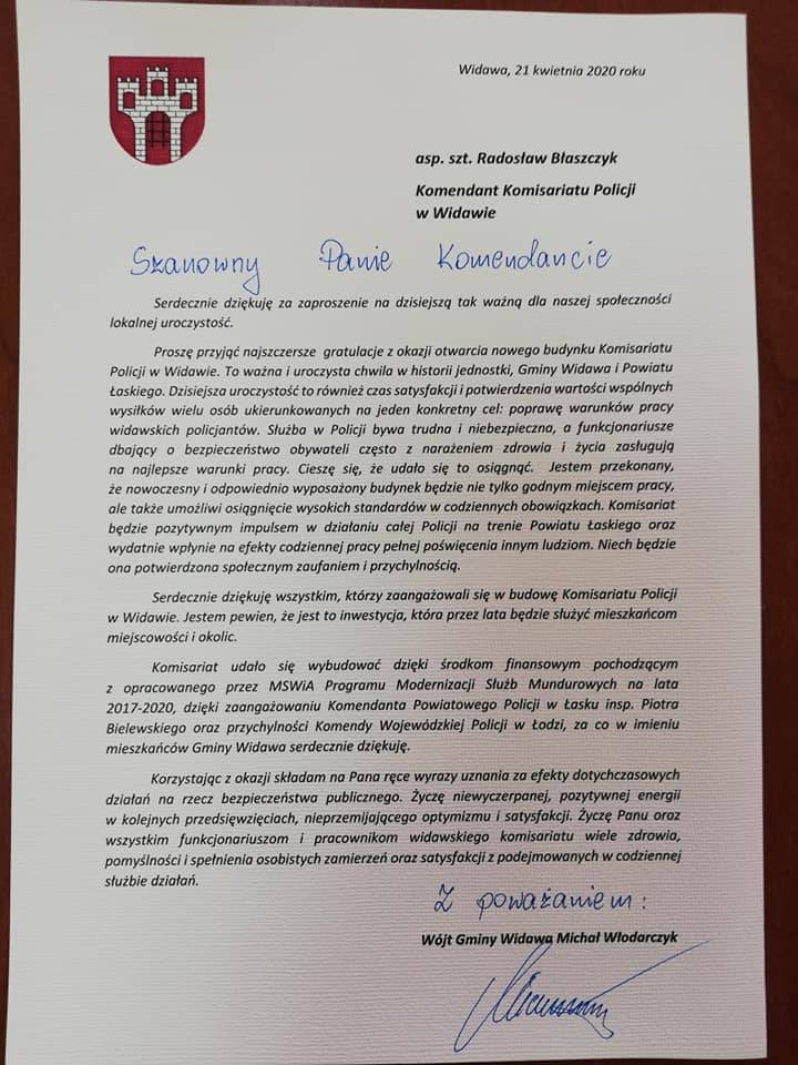 - To podniosła chwila, bowiem wiele lat zabiegów o powstanie nowego komisariatu dziś przyniosło wymierny efekt - informuje Wójt Michał Włodarczyk. - Budowa nowego komisariatu rozpoczęła się w minionym roku na działce przekazanej przez Gminę Widawa. Koszt całkowity budowy to ponad 3 miliony złotych. Komisariat będzie obsługiwał Gminę Widawa i Sędzejowice. Cieszę się, że funkcjonariusze, których obecnie jest 10 będą pracować w doskonałych warunkach.