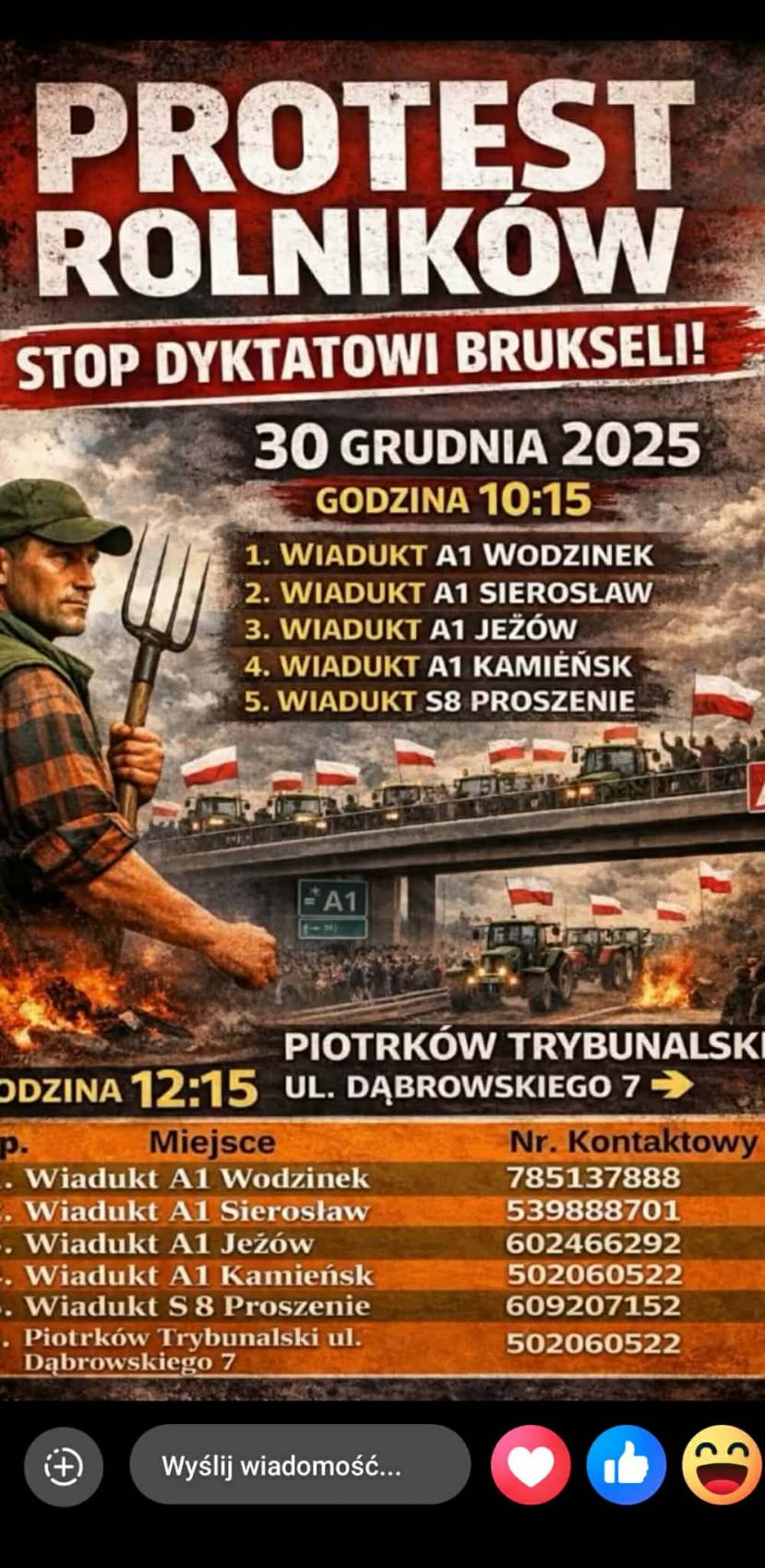 Blokady rozpoczną się około godziny 10:15. Rolnicy wjadą na wiadukty nad autostradą A1 oraz drogą ekspresową S8 w następujących lokalizacjach:
