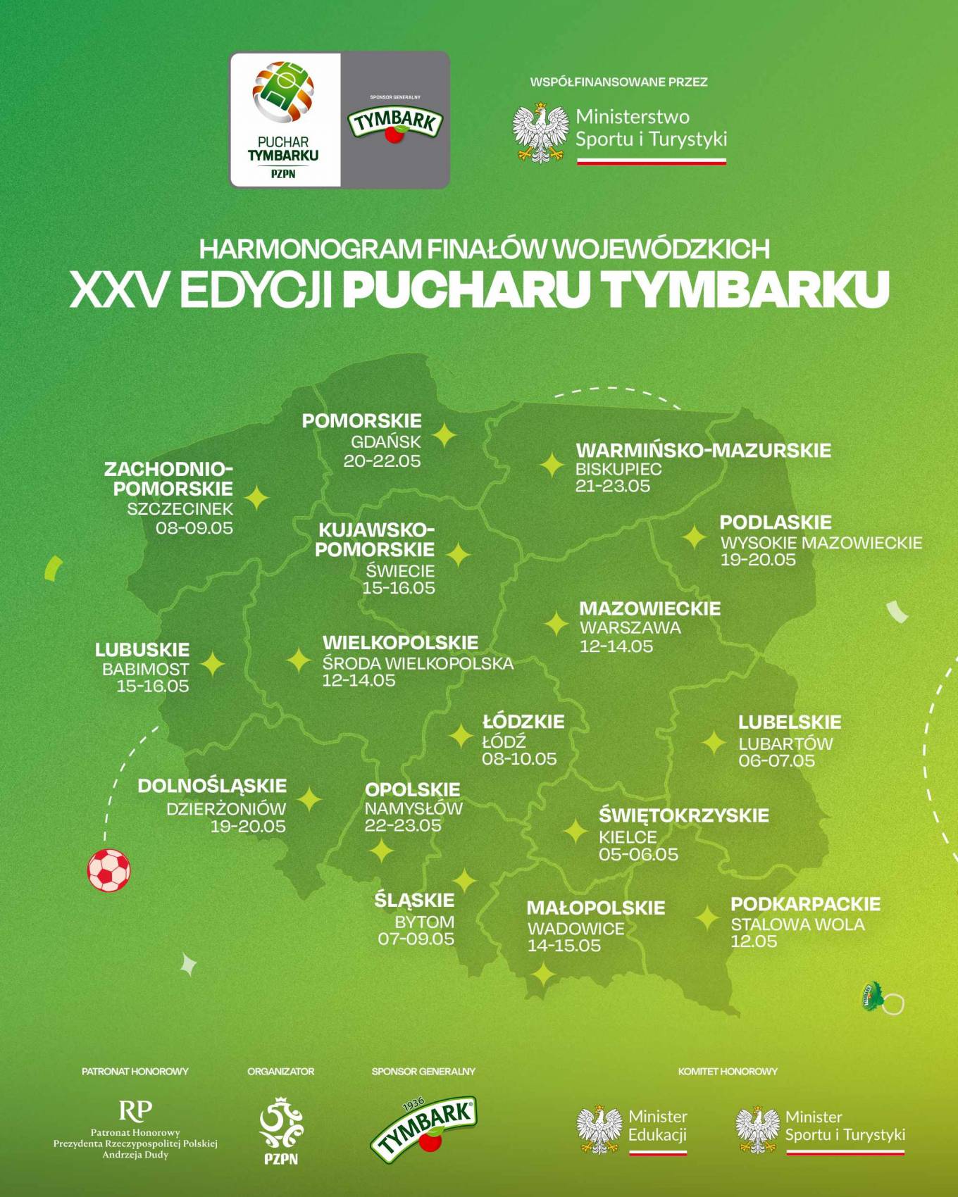 Etap wojewódzki XXV edycji Pucharu Tymbarku zgromadzi na boiskach ponad 20 tys. dziewczynek i chłopców, czyli największe piłkarskie talenty do lat 8, 10 i 12 ze wszystkich województw. Zostanie zainagurowany w województwie świętokrzyskim, gdzie 5 maja na boiska w Kielcach wybiegną piłkarki i piłkarze w kategorii U-12 oraz dziewczęta w kategorii U-8. Ostatnie zmagania etapu wojewódzkiego zaplanowano 23 maja w województwach opolskim i warmińsko-mazurskim. Jak co roku, w kategorii U-8 rywalizacja zakończy się na poziomie wojewódzkim, natomiast najlepsze drużyny U-10 i U-12 zagrają w czerwcu w Finale Ogólnopolskim rozgrywanym w Chorzowie.