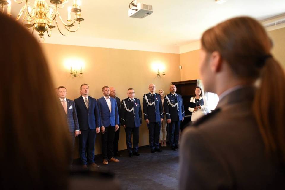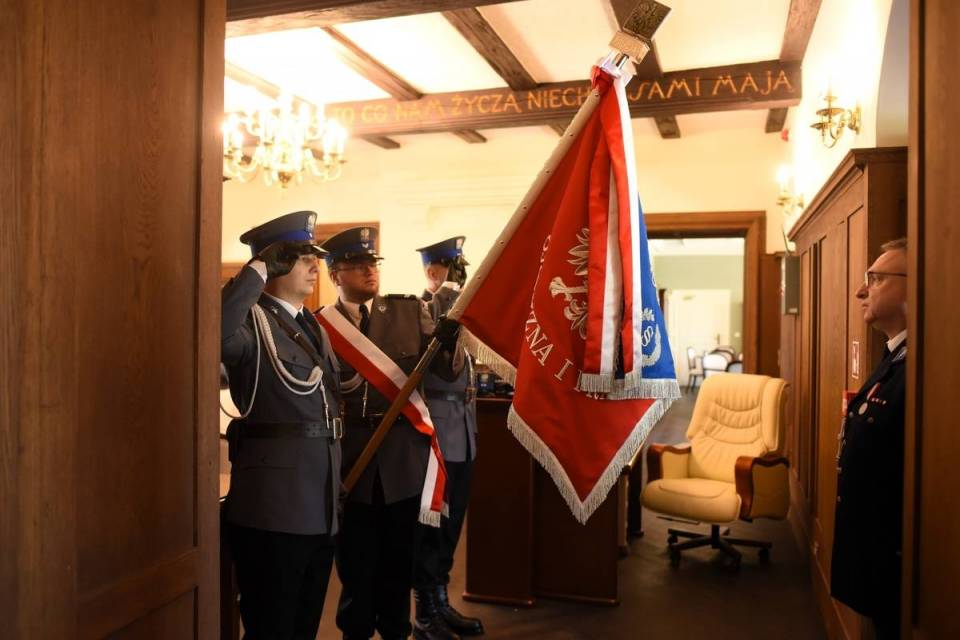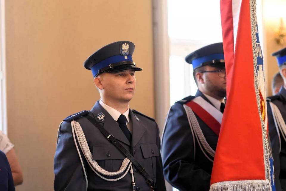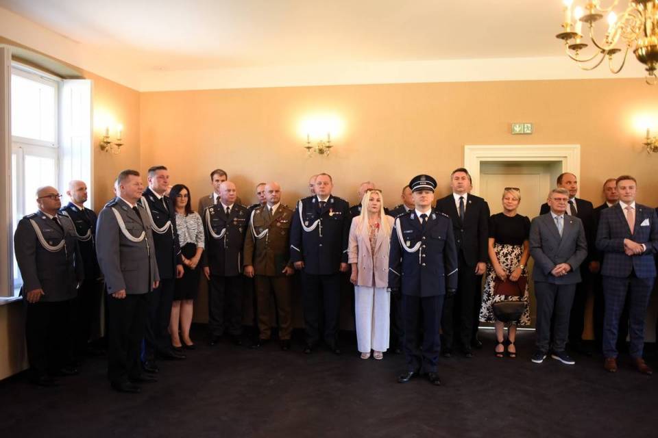 Dalsza część obchodów odbyła się w dworze Szweycera w Ostrowie. Uroczystość z okazji 105. rocznicy powstania Policji Państwowej rozpoczął Komendant Powiatowy młodszy inspektor Grzegorz Sas witając wszystkich zebranych gości, wśród których byli przedstawiciele lokalnych władz samorządowych, służb mundurowych, instytucji, które współpracują z Komendą Powiatową Policji w Łasku oraz rodziny funkcjonariuszy. Komendant podczas swojego przemówienia złożył życzenia policjantkom, policjantom oraz pracownikom łaskiej jednostki policji dziękując za rzetelną i oddaną służbę oraz zaangażowanie i odpowiedzialne wykonywanie obowiązków służbowych. Z ust komendanta popłynęły też słowa wdzięczności dla przedstawicieli władz samorządowych oraz instytucji za wzorową współpracę wspierającą pracę łaskich policjantów.