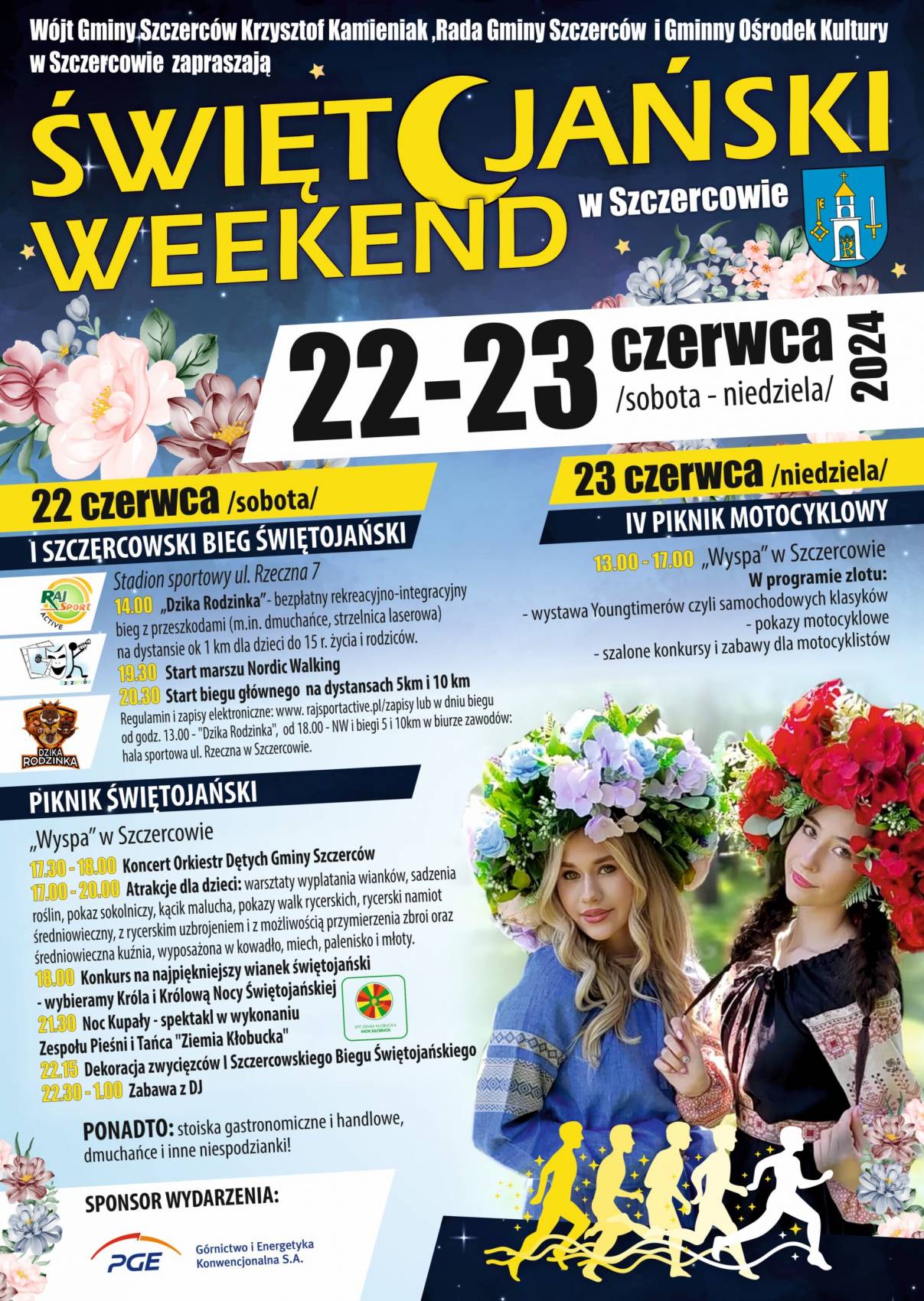 Starsi będą mogli wziąć udział w marszu Nordic Walking oraz wieczornego biegu na 5 lub 10 km. Regulamin i zapisy elektroniczne >>> TUTAJlub w dniu biegu od godz. 18.00 w biurze zawodów w hali sportowej przy ul. Rzeczna w Szczercowie. W tym dniu atrakcje będą czekać także na szczercowskiej „Wyspie". Zagrają dla nas orkiestry dęte. Swój obóz rozłożą także rycerze z Bractwa Rycerskiego Ziemi Sieradzkiej. Będą także warsztaty plecenia wianków, sadzenia roślin, a o 18.00 ruszy tradycyjny konkurs wianków. Dla autorów najpiękniejszych mamy oczywiście wspaniałe nagrody! Ok. 21.30 będzie okazja przenieść się w czasie wspólnie z Zespołem Pieśni i Tańca „Ziemia Kłobucka", który przy płonących ogniskach zaprezentuje widowisko „Noc Kupały". Będzie i zabawa z DJ, a w niedzielę tradycyjny Piknik Motocyklowy!