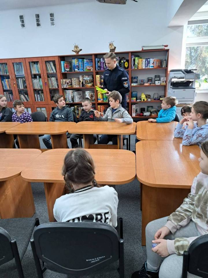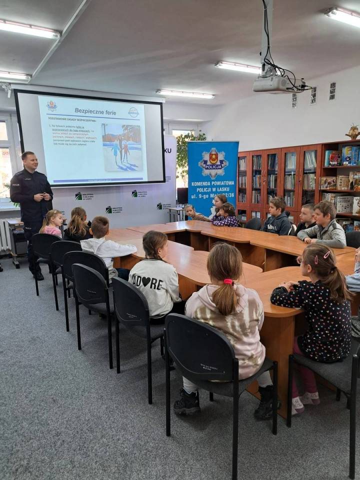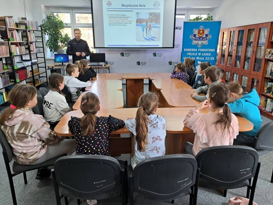 W poniedziałek, pierwszego dnia ferii zimowych, funkcjonariusz z Komendy Powiatowej Policji w Łasku spotkał się z dziećmi na półkoloniach zorganizowanych przez Bibliotekę Publiczną w Łasku.