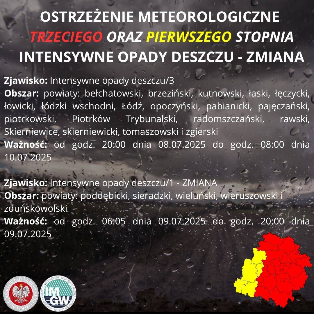 Ostrzeżenie najwyższego, 3. stopnia przed ulewami objęte są powiaty: